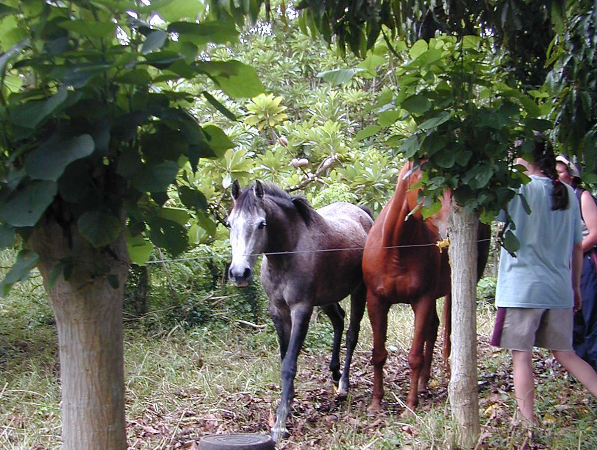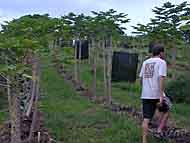 ![]() click here for Hi Res image Here is a fence constructed of one strand of electrical wire and Wiliwili trees. Pangaia integrates large animals into their design - horses and goats. |