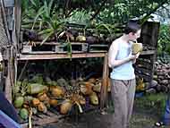 ![]() click here for Hi Res image Anastasia enjoys some coconut milk with harvested and sprouting coconuts behind her. |