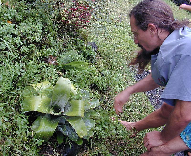 Name: Bromeliad (species?) Notes: John explains that although bromeliads are attractive they should not be planted next to human dwellings because they capture water in their center and create a breeding ground for mosquitos. |
