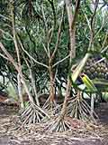 Hawaiian Name: Hala or Pu hala | Name: Screw Pine | Scientific Name: Pandanus tectorius Notes: This tree is either indigenous to Hawai'i and/or it was brought here in canoes by Polynesians. Hala mats and baskets are made from this plant. Also used to make paint brushes. Some varieties are good to eat and the root tips have medicinal values. Males have fragrant flowers, |
