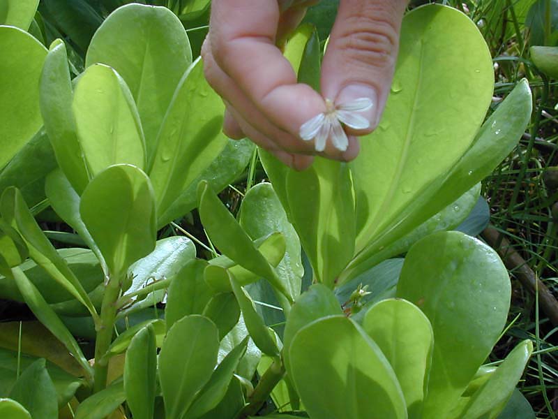 Hawaiian Name: Naupaka or Naupaka kahakai | Scientific Name: Scaevola serica Notes: Grows right on shoreline. Flowers can be used as defogger for diving mask. |